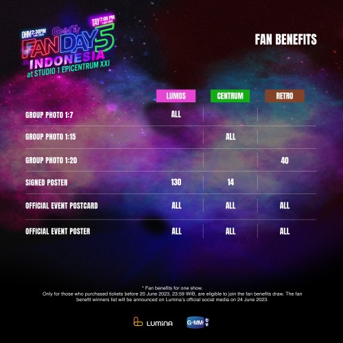 Three categories will be available for the ‘GMMTV FANDAY 5 IN INDONESIA’ with ticket prices ranging from 750 thousand to 2.4 million Rupiah with tons of benefits. Each category comes with various benefits on top of different visibility levels.