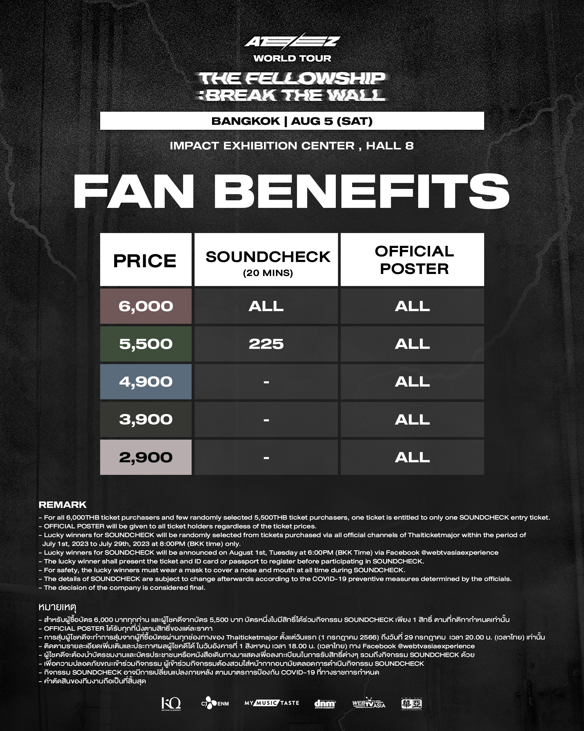 ATEEZ is a high-energy boy group known for their explosive performances, and consists of 8 members: HongJoong, SeongHwa, YeoSang, WooYoung, Yunho, MinGi, San and JongHo. Since their debut, they have been highly successful and have a huge following on social media, especially on Twitter. They are considered one of the most popular Korean boy bands and have a massive fan club all over the world, including in Thailand where there are many ATINY fans eagerly waiting to meet them. With the announcement of the concert tour, ATEEZ is ready to deliver a fun-filled experience for Thai fans at the 2023 ATEEZ WORLD TOUR [THE FELLOWSHIP : BREAK THE WALL] IN BANGKOK. The tickets will go on sale on Saturday July 1st, 2023, at 10.00am through all ThaiTicketMajor branches and http://www.thaiticketmajor.com. The ticket prices are 6,000 baht, 5,500 baht (standing), 4,900 baht, 3,900 baht, and 2,900 baht. Additionally, there will be special privileges for all ATINY who purchase the 6,000 baht tickets and 225 lucky ATINYs (Random) who purchase 5,500 baht tickets to enjoy the Soundcheck.