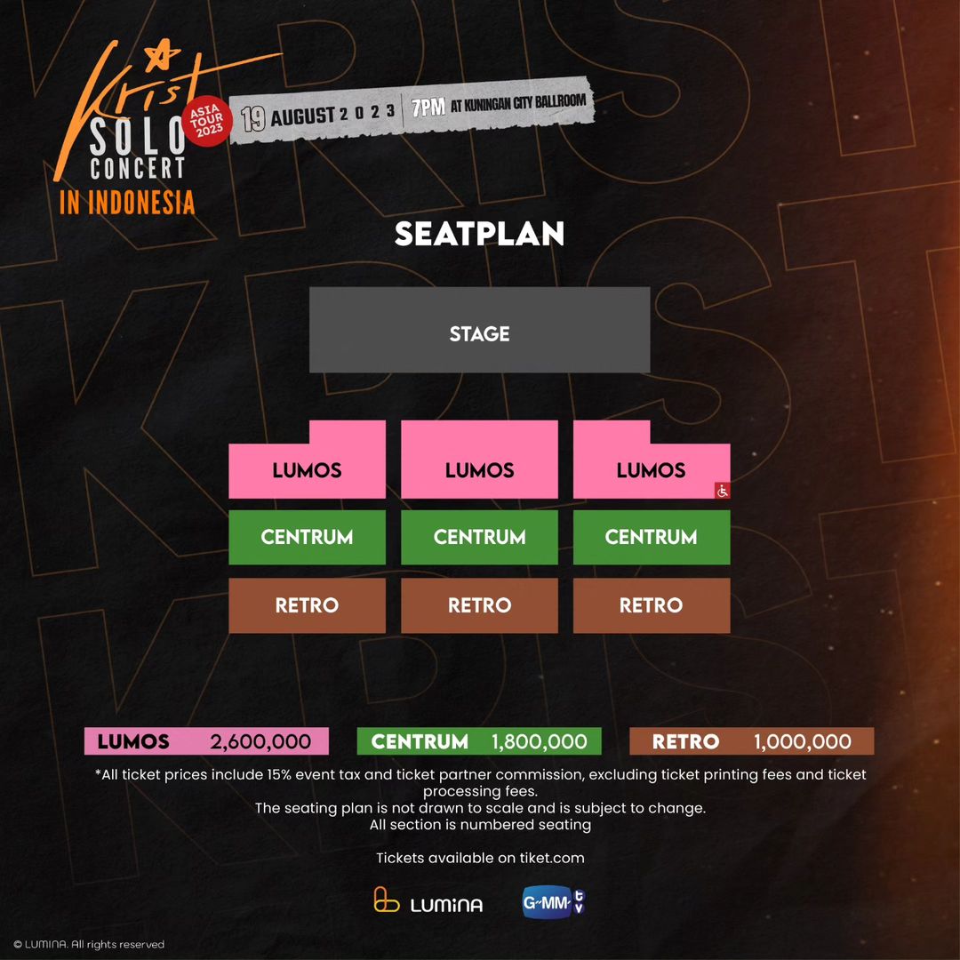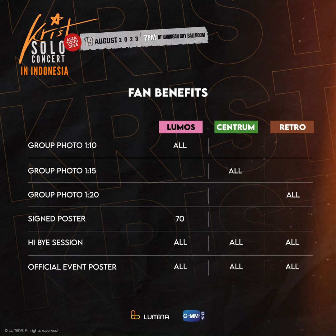 Tickets are priced at Rp 1,000,000, Rp 1,800,000, and Rp 2,600,000 with benefits for each section. All ticket holders will get an official event poster, group photo and hi bye session with Krist. For 70 Lumos ticket holders, also had the opportunity to get a signed poster.