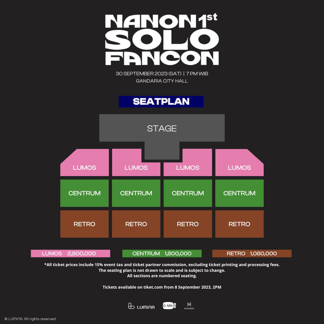 ‘NANON 1ST SOLO FANCON IN JAKARTA’ memiliki tiga kategori, LUMOS, CENTRUM, RETRO dengan harga tiket mulai dari Rp 1.080.000 dengan banyak keuntungan. Rincian benefit bagi para penggemar sebagai berikut:
