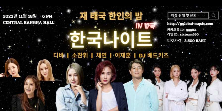 YGLOBAL MUSIC and PSM are ready to hold a special party for Thai K-POP fans with ‘Korean Night in Bangkok’ which will be held at Central Bangna Hall from 6 PM on November 18, 2023. This party event will bring in Korean popular singers from the 1990s and early 2000s, including Cool‘s Lee Jae Hoon, Chaeyeon, Diva, So Chan Hwi, and Bad Kids who were scheduled to perform in 3 hours concert. The show is supported by Korean Association of Thailand as the title sponsor, and TENPRO Tenpercent, GA Project Company, Miwoo Clinic, Chigochichi Golf Tour, Ginogem Gem&Jewerly and BUMRUNGDEE companies.