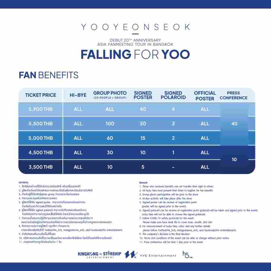 Tickets can be purchased via www.vveentertainment.com and the ticket price is 5900 / 5500 / 5000 / 4500 / 3500 baht. Each category comes with varied benefits. details of benefits for each category are as below: