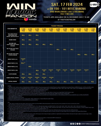 You can reserve tickets from Sunday, December 24, 2023 at 10:00 a.m. onwards. Ticket prices 7,500 / 6,500 / 6,000 / 5,500 / 5,000 / 4,000 / 3,500 / 3,000 / 2,500 / 2,000 / 1,500 baht and watch live via T TM LIVE ticket price 1,500 / 1,200 baht (link and viewing code) If you want to receive a commemorative plastic card, pay an additional 30/card at every Thai Ticket Major branch or www.thaiticketmajor.com and Call center, call 0-2262-3456 or follow More details at http://www.thaiticketmajor.com or http://www.facebook.com/gmmtvofficial & Instagram & X & TikTok & YouTube & Weibo : GMMTV
