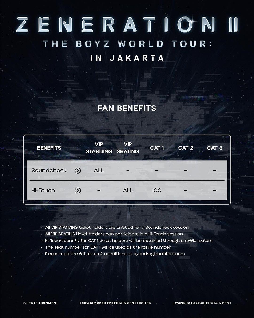 All sections are seating except for the VIP Soundcheck is standing. All Prices exclude 10% government tax and a ticketing platform fee of 5%. All ticket holders of THE BOYZ WORLD TOUR: ZENERATION Ⅱ in JAKARTA with VIP Soundcheck category are entitled to attend the soundcheck session and VIP Hi Touch category ticket holders are entitled to attend the Hi-Touch session. CAT 1 ticket holders are also eligible for Hi-Touch Fan Benefits with a raffle system only for 100 pax.