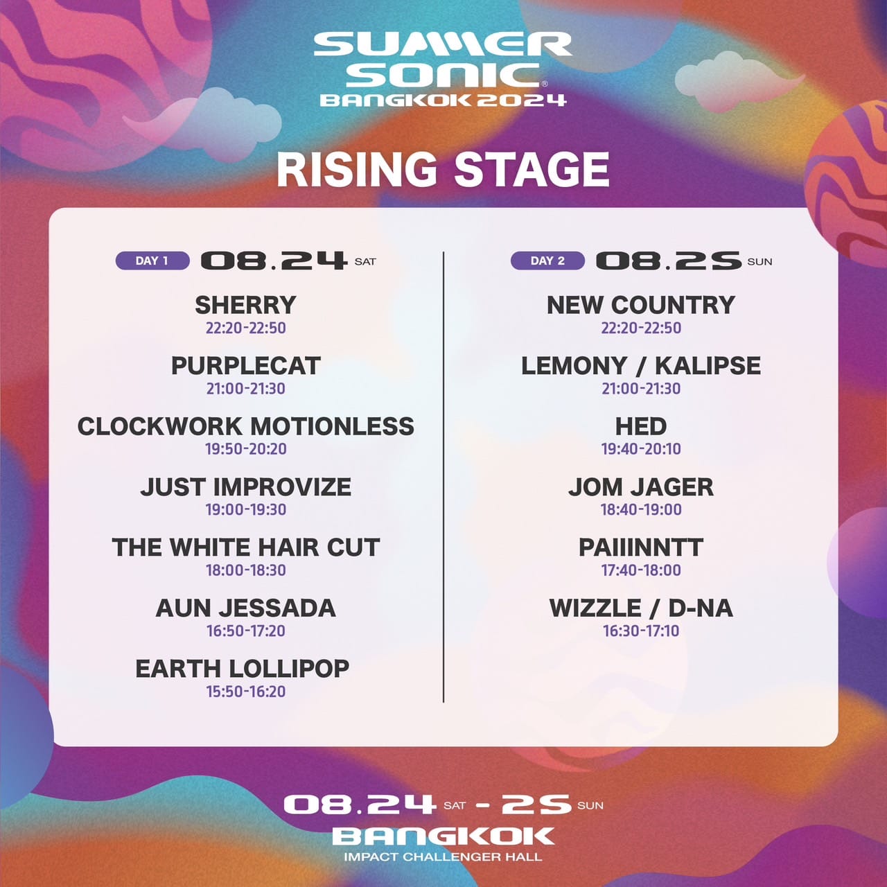 In addition, “SUMMER SONIC BANGKOK” features a special Rising Stage dedicated to promoting Thai artists on a global scale. This stage aims to enhance Thailand’s image and reputation in tourism, music, and culture, showcasing Thai talent to an international audience. Over the two days, the Rising Stage will present a variety of Thai artists including PAIIINNTT, HED, CLOCKWORK MOTIONLESS, THE WHITE HAIR CUT, SHERRY, and more.