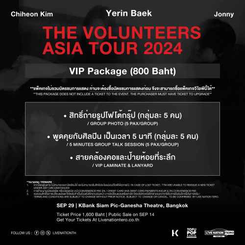 Thai fans won’t want to miss this opportunity to create memorable moments with The Volunteers. VIP packages are also available, offering special access for meet-and-greet sessions and group photo opportunities with the artists at an additional 800 THB. For more details and to purchase tickets, visit thaiticketmajor.com or check out Live Nation Tero’s social media channels and website at livenationtero.co.th.
