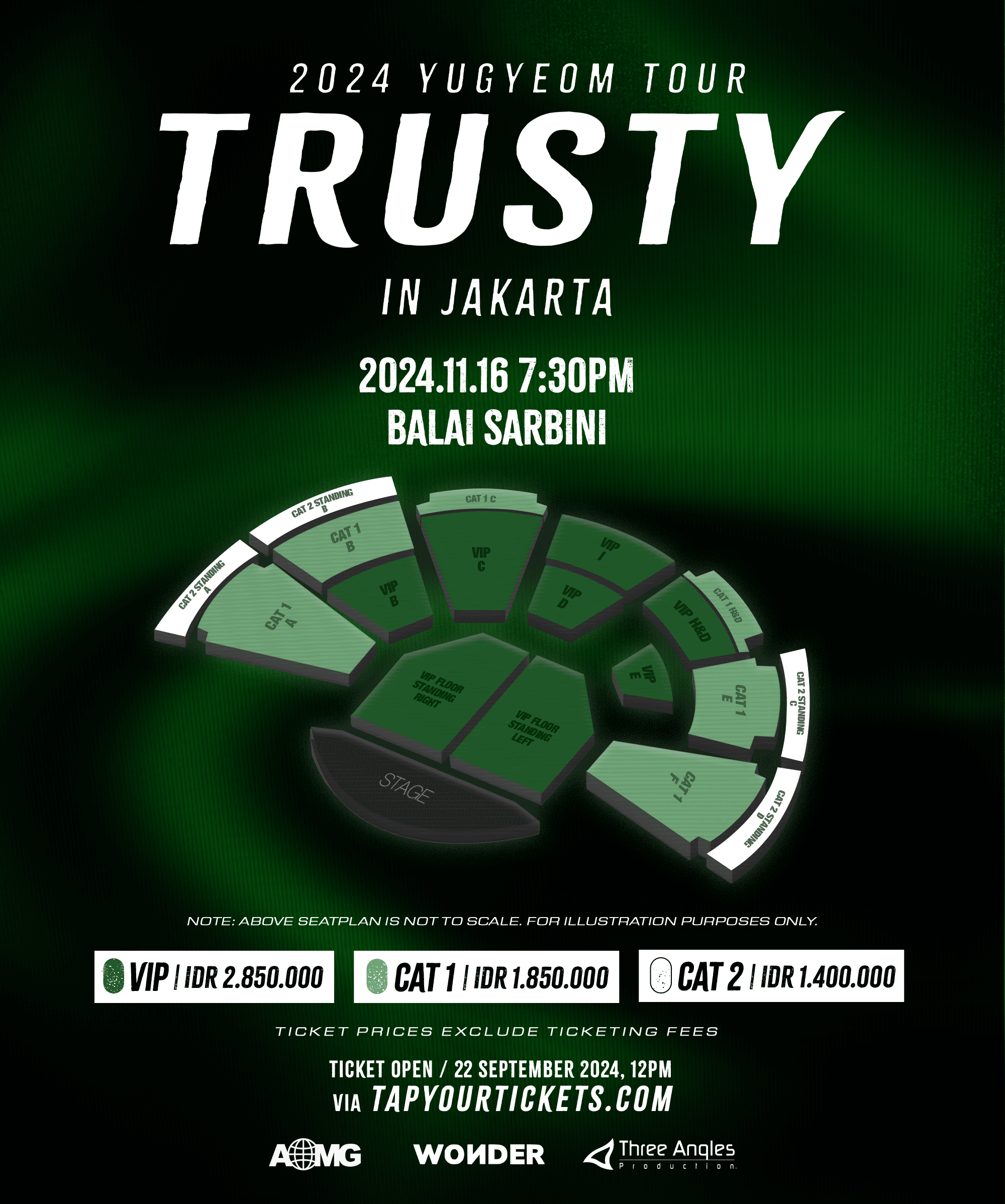 Organized by Three Angles Production, the 2024 YUGYEOM TOUR [TRUSTY] IN JAKARTA will allow Ahgases to share intimate moments with YUGYEOM through the fan benefits; these include group photo opportunities and a soundcheck session. To make this event even more special, each and every attendee will receive an official photocard and poster. Along with this, VIP attendees will also receive a VIP ID & Lanyard. Additionally, VIP and CAT1 attendees have the chance to win a signed poster during the raffle draw.