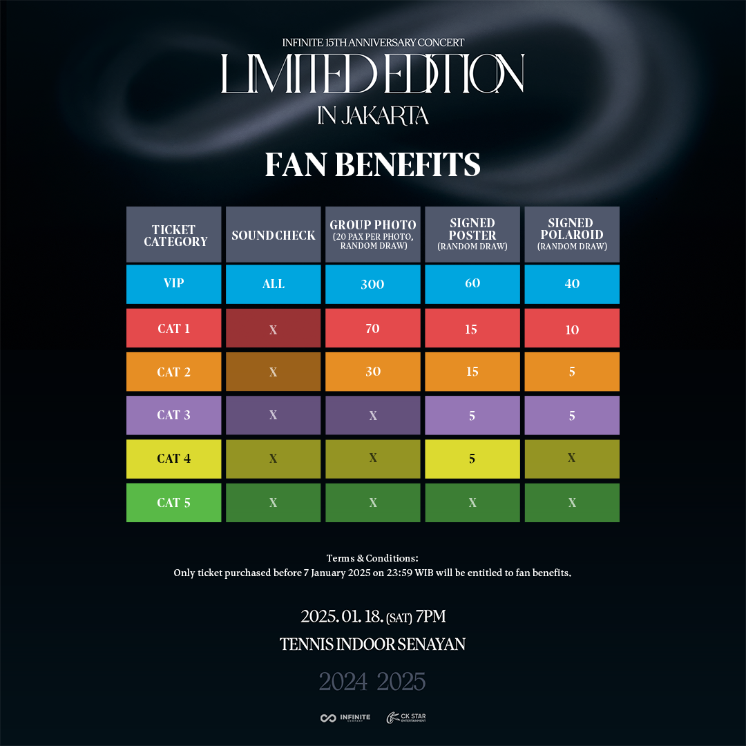 Ticket sales will kick off on 2 December 2024, at 10:00 AM. Be prepared to grab your tickets at www.infiniteinjakarta.com where you’ll find six different categories available: