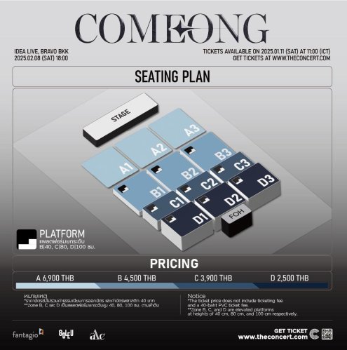 - ฿6,900 / ฿4,500 / ฿3,900 / ฿2,500 (excluding ticket issuance and plastic card fees).