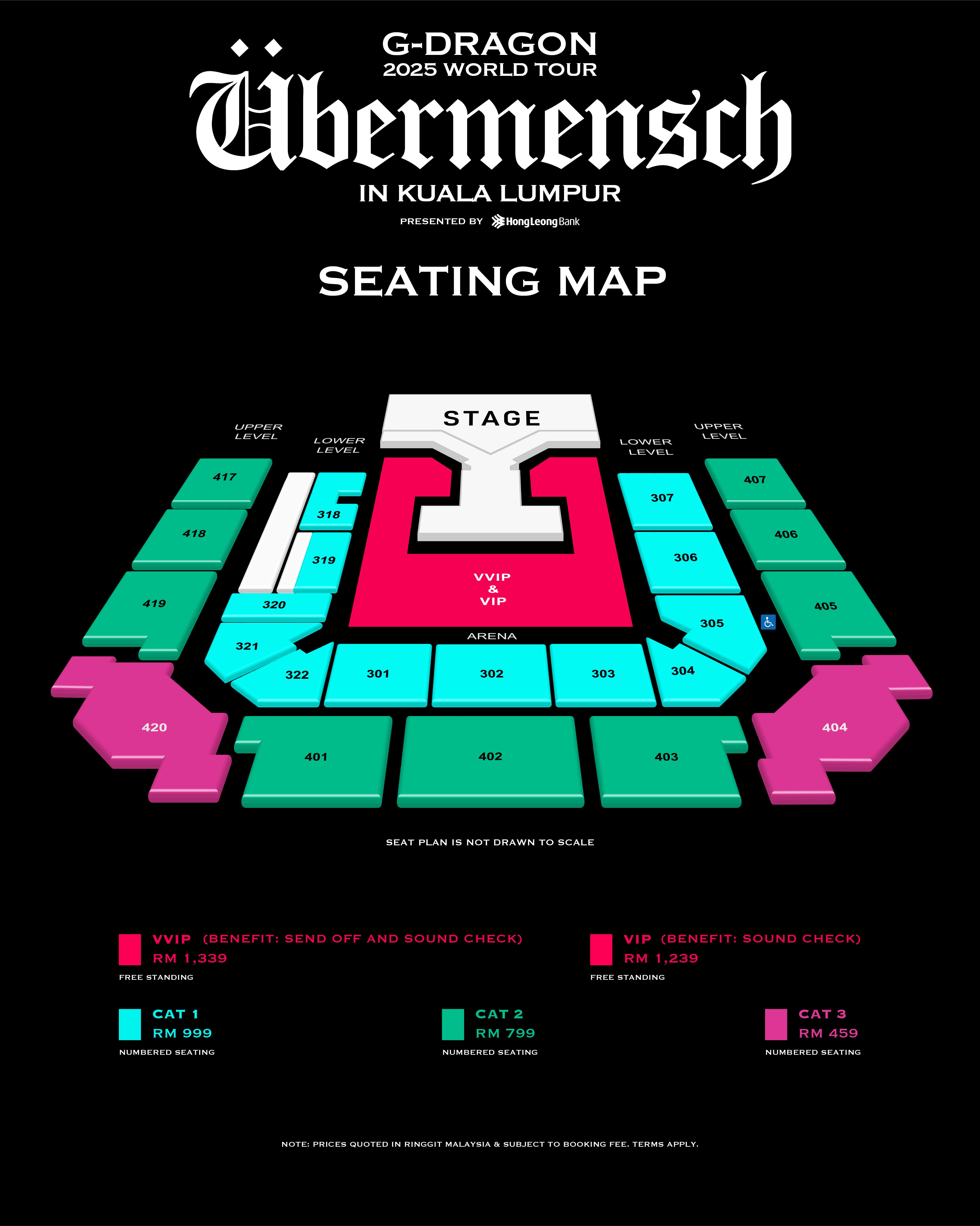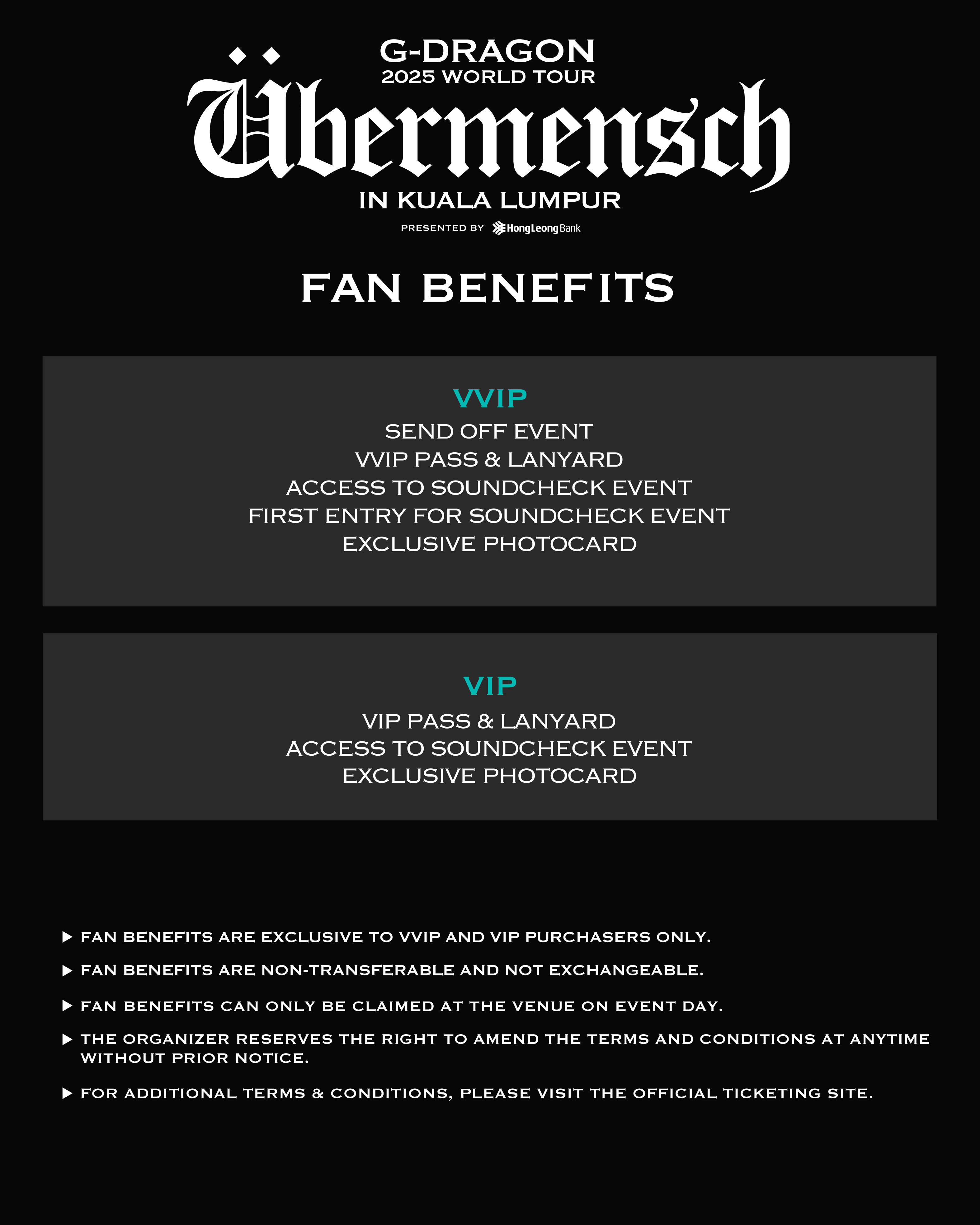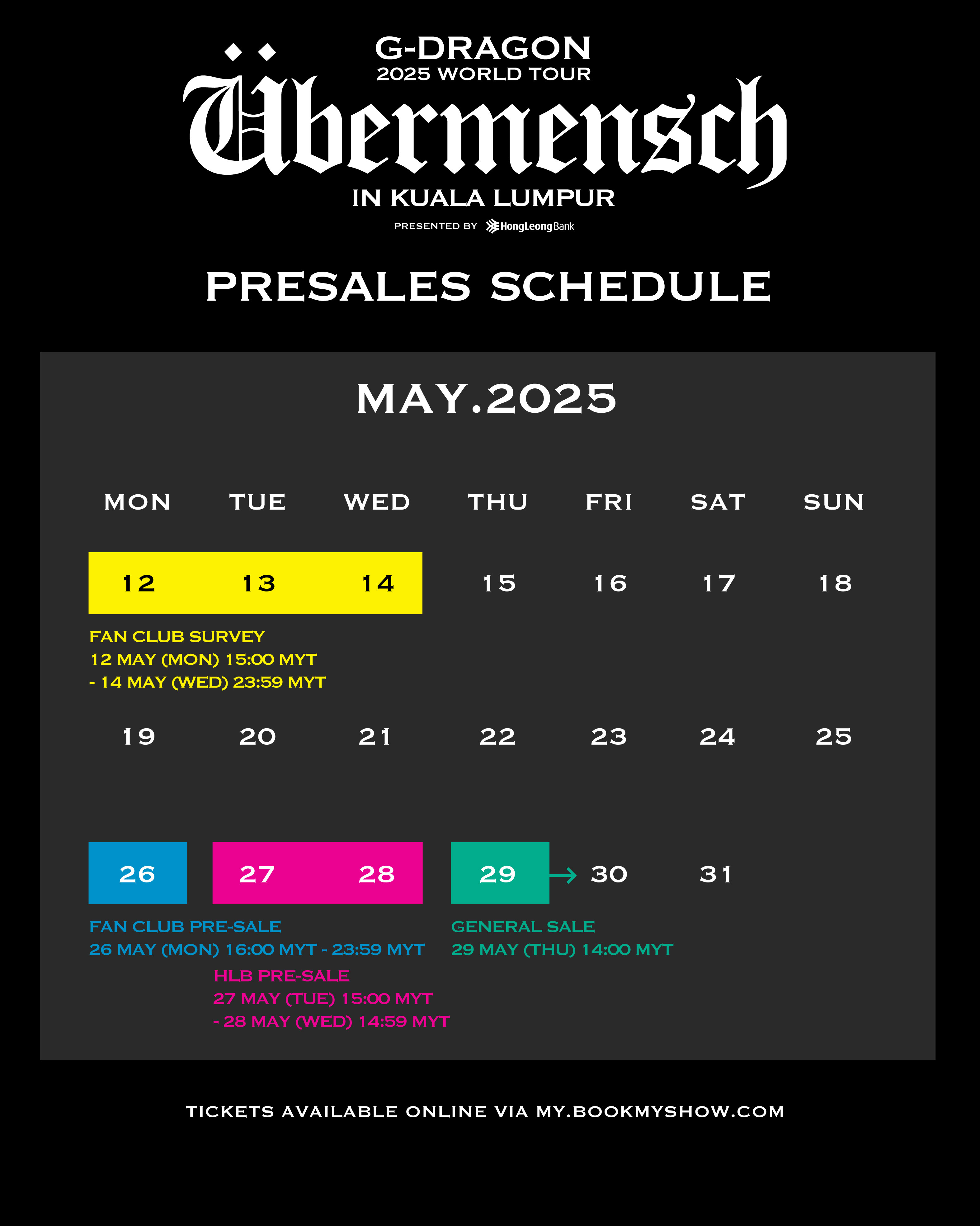 Promoted by AEG Presents, TME live, Star Planet and Top-top Production, G-DRAGON 2025 WORLD TOUR [Übermensch] IN KUALA LUMPUR, presented by Hong Leong Bank will take place on 19th and 20th July 2025, at the Axiata Arena, Bukit Jalil, Kuala Lumpur.