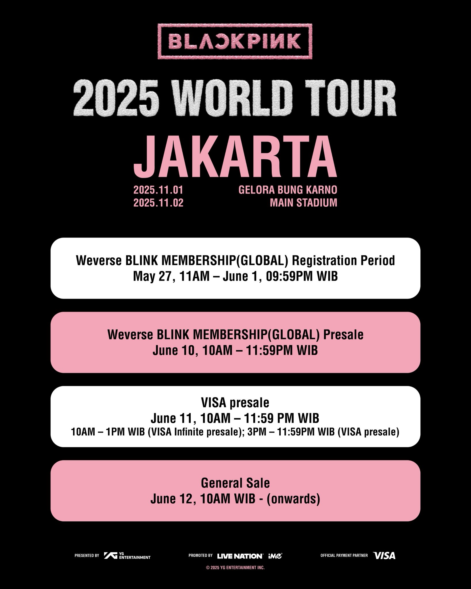 Selama beberapa tahun terakhir, para anggota BLACKPINK — JISOO, JENNIE, ROSÉ, dan LISA — telah meluncurkan karier solo yang sangat sukses, merilis berbagai lagu hits yang menduduki puncak tangga lagu.TIKET: Tiket akan tersedia mulai Selasa, 10 Juni melalui presale Weverse, diikuti oleh presale VISA pada Rabu, 11 Juni (detail di bawah). Penjualan umum akan dimulai Kamis, 12 Juni pukul 12 siang waktu setempat di Tiket.com.