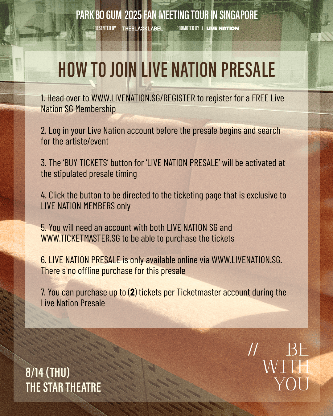 PARK BO GUM 2025 FAN MEETING TOUR [BE WITH YOU] IN SINGAPORE will take place at The Star Theatre on 14th August 2025 (Thu), 7:00pm. All ticket holders will enjoy an intimate hi-bye session with PARK BO GUM after the show and receive a printed poster featuring a message prepared for his Singapore fans. As a bonus, all [BE WITH YOU] Package ticket holders will receive a rare 1:2 group photo opportunity with him and will also get their hands on a postcard set with one autographed postcard, hand-signed by artiste himself.