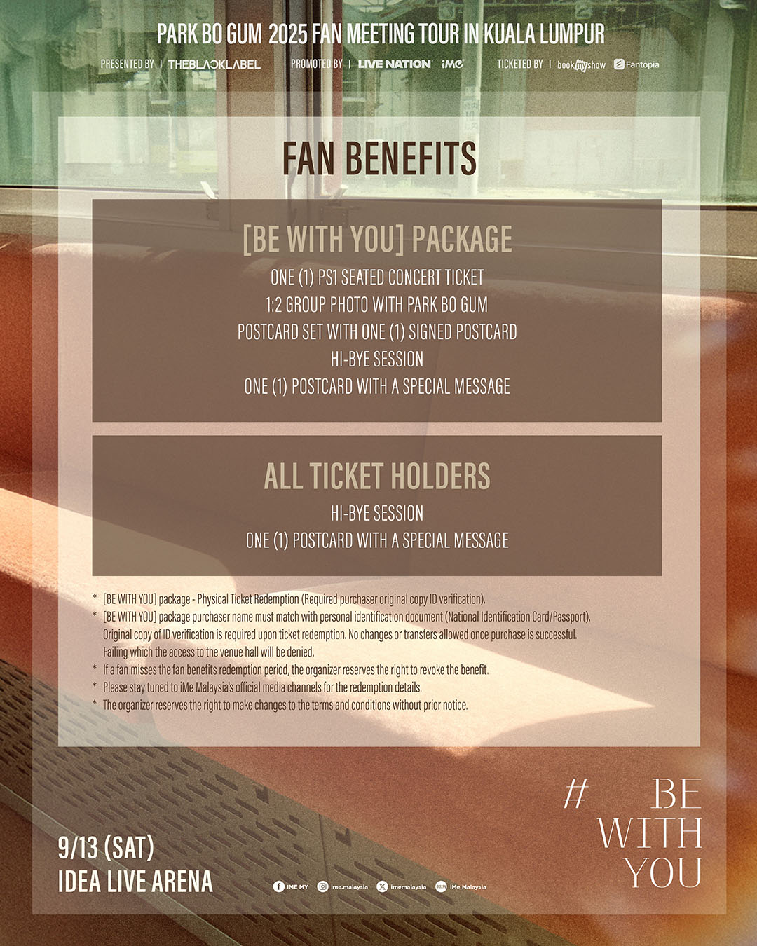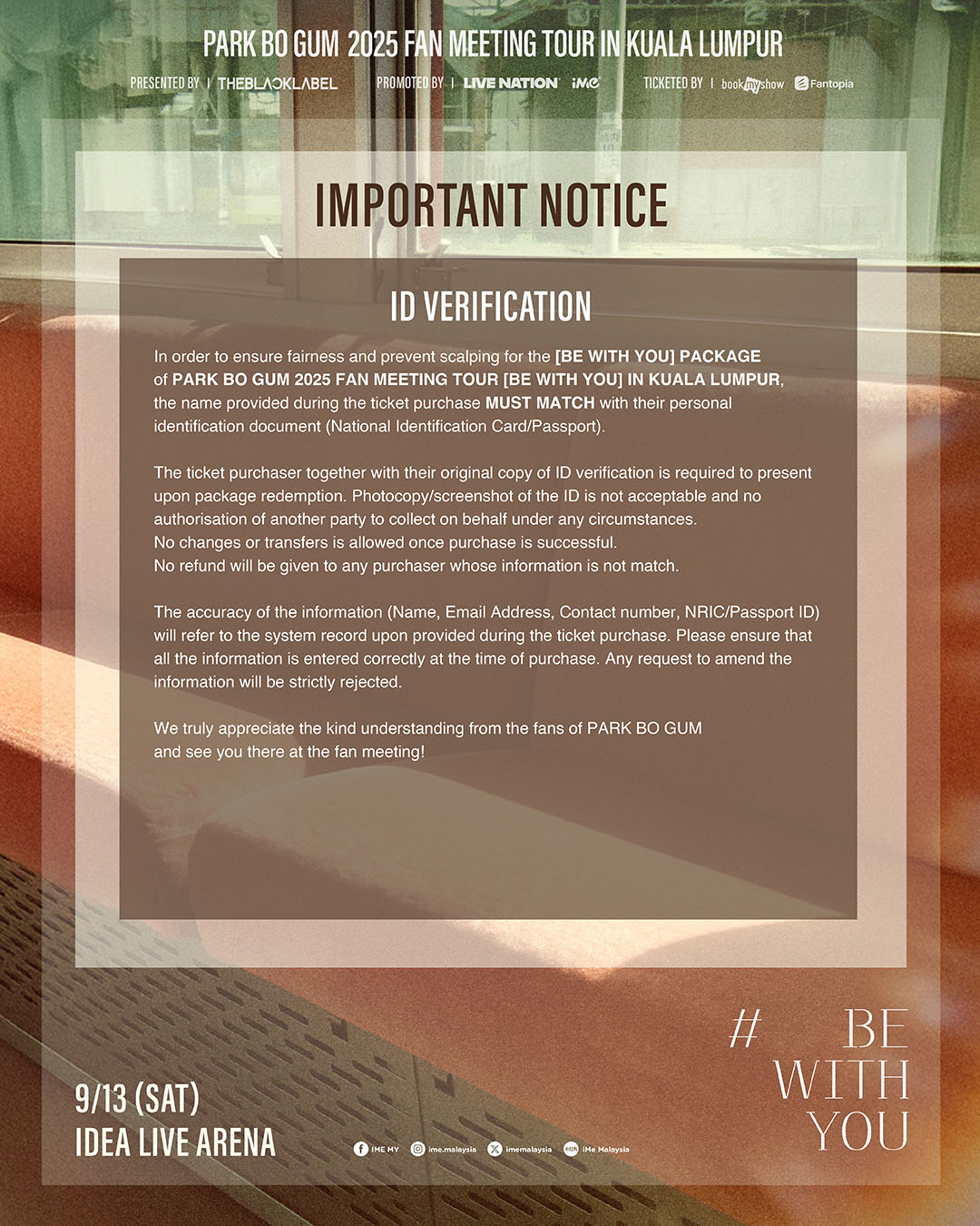 Fans are strongly advised not to purchase tickets from unauthorized sellers or third parties to avoid scams and invalid tickets. To ensure a fair ticketing experience and prevent scalping, fans who purchase the BE WITH YOU package will be required to submit accurate personal information and present original ID for verification during benefit redemption.