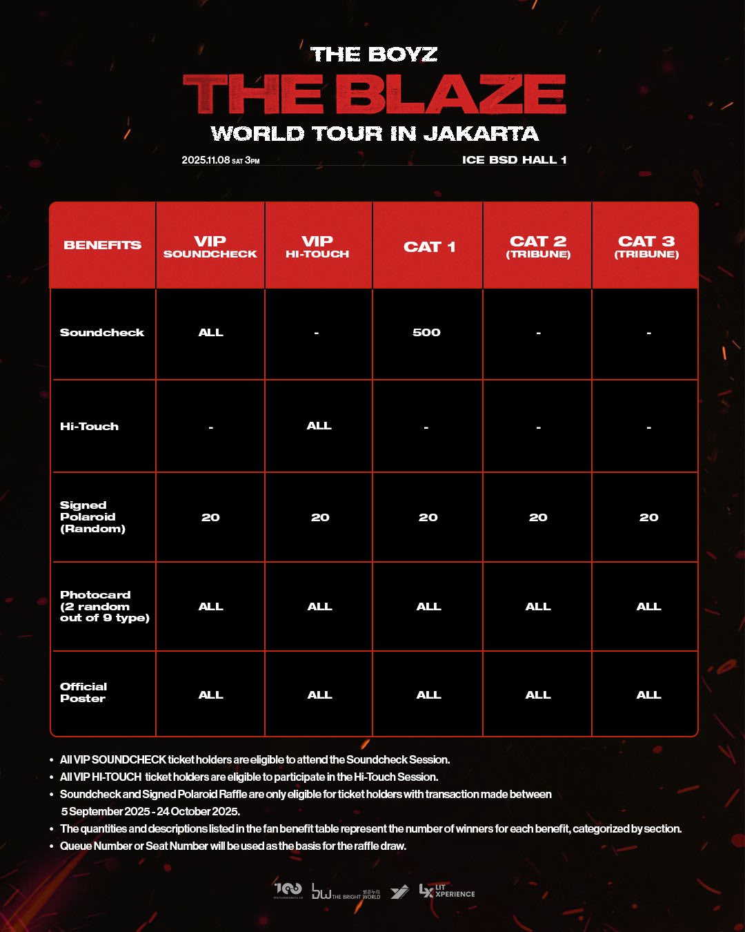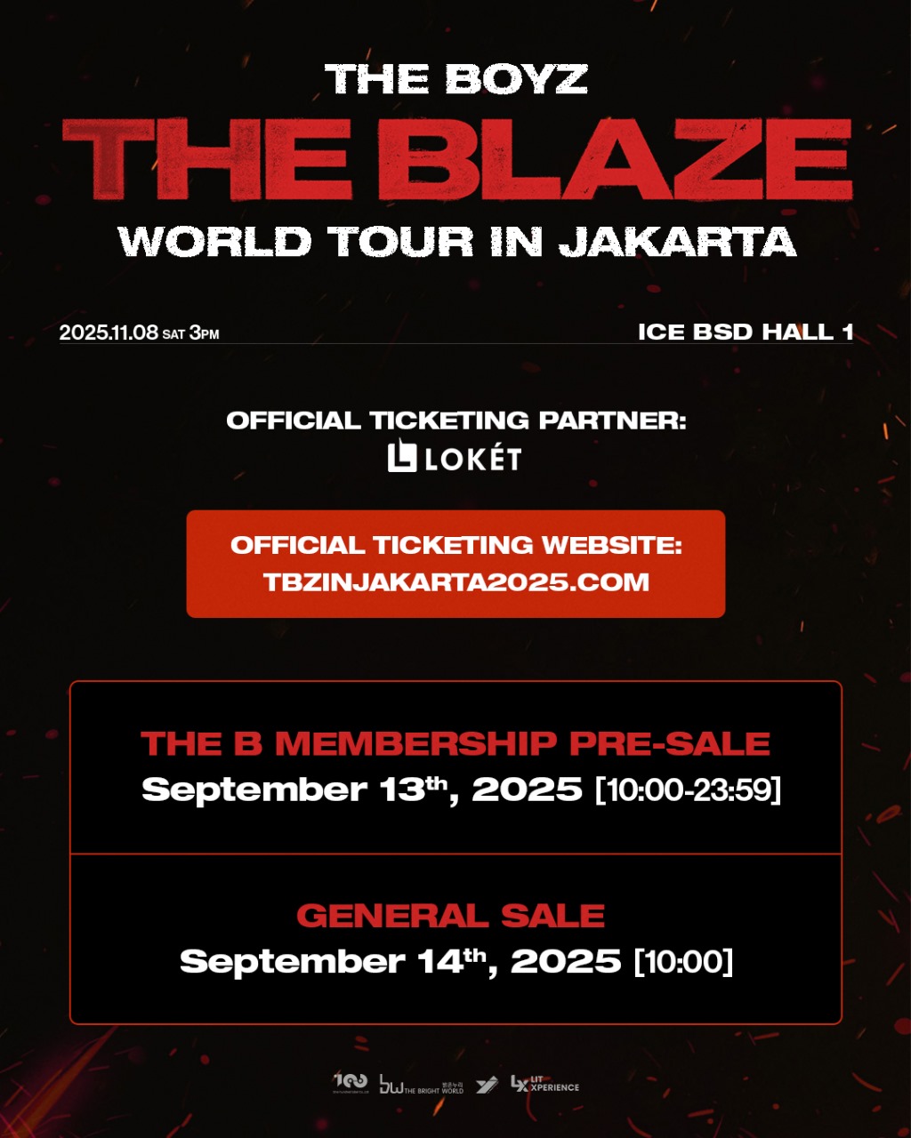 Ticket sales for THE BOYZ <THE BLAZE> WORLD TOUR in JAKARTA began with an exclusive The B Membership Pre-sale on September 13, 2025, followed by the General Sale on September 14, 2025, at 10:00 AM WIB. Fans can secure their tickets through the official website tbzinjakarta2025.com and via the Loket X app.